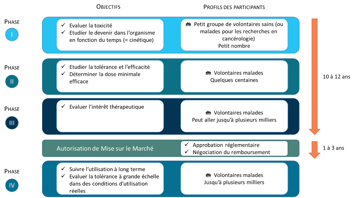 Il existe 4 phases d’essai cliniques, 3 étapes incontournables avant la mise sur le marché du nouveau médicament et 1 étape après l’obtention de l’autorisation de mise sur le marché.